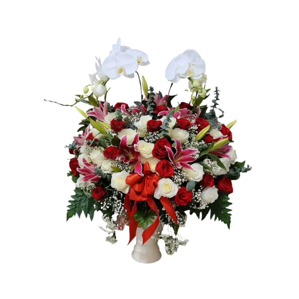 Vas putih tinggi dengan desain elegan yang digunakan sebagai dasar bunga vase Aurelien memberikan dukungan sempurna terhadap bentuk dan volume rangkaian. Bentuk vas yang klasik mempertegas kesan mewah dan menjadikan bunga ini cocok diletakkan di ruang tamu mewah, lobi hotel bintang lima, ruangan VIP kantor, atau bahkan sebagai centerpiece dalam acara formal. Selain itu, pita merah besar yang menghiasi bagian depan vas memberikan sentuhan akhir yang berkelas sekaligus manis, menambah daya tarik visual dari komposisi ini.