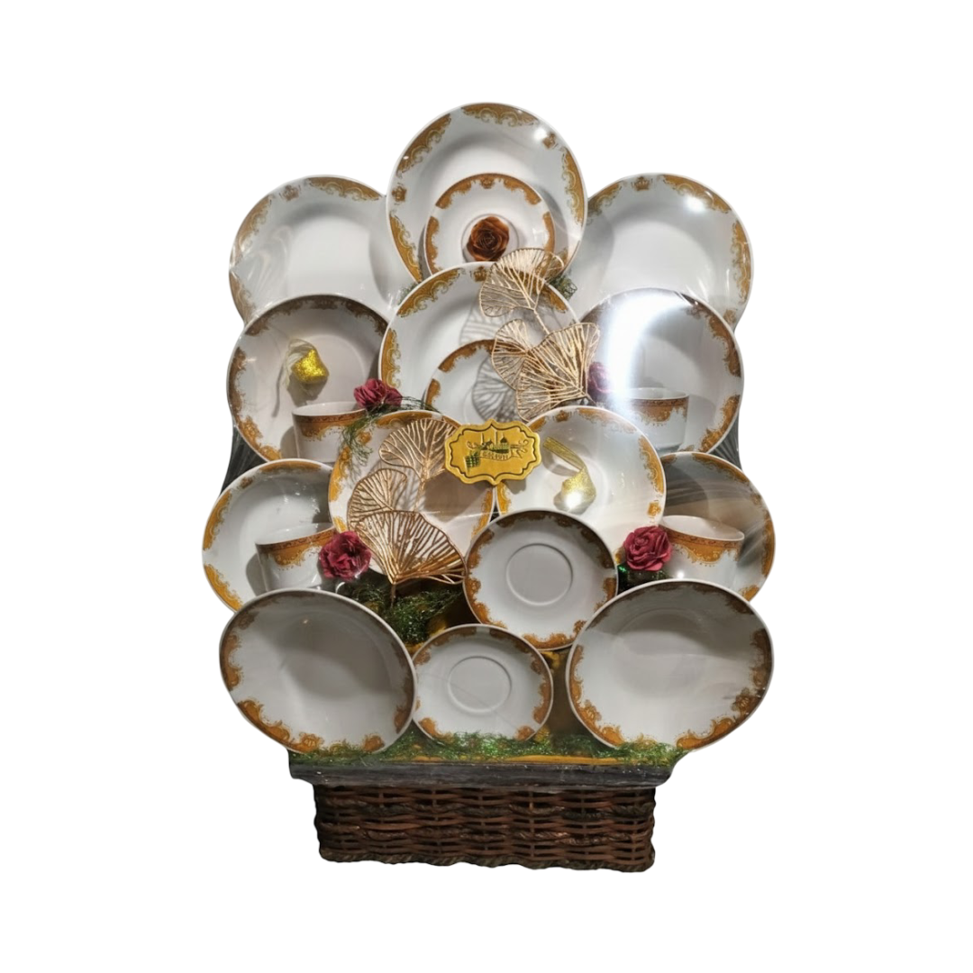 Secara visual, Parcel Lebaran Berkaied menampilkan kemegahan yang luar biasa melalui penataan perangkat makan keramik yang disusun menyerupai mahkota yang mekar. Seluruh set ini diletakkan di atas sebuah keranjang anyaman rotan berwarna cokelat gelap yang kokoh, memberikan kesan klasik dan authentic pada keseluruhan hantaran. Keranjang rotan ini tidak hanya berfungsi sebagai wadah, tetapi juga menambah nilai estetika rustic yang mewah, menjadikannya sangat stabil untuk menopang beban perangkat porselen di atasnya. Dominasi warna putih bersih pada porselen yang dipadukan dengan aksen emas yang melingkar di setiap sisinya menciptakan kontras yang sangat memukau dan memberikan aura “bangsawan” pada hantaran ini.