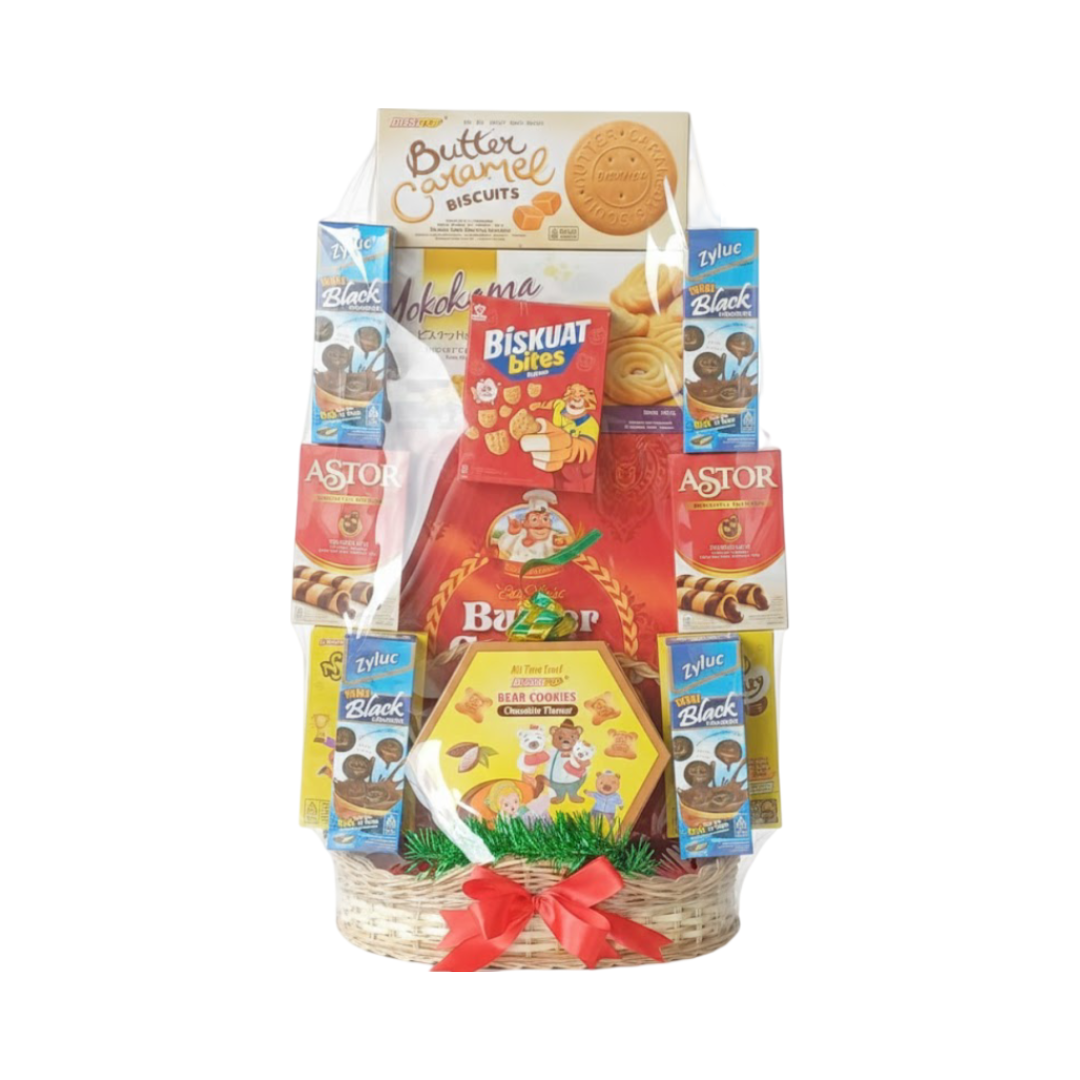 Rayakan Idul Fitri dengan kehangatan tradisi dalam balutan eksklusif Parcel Lebaran Rabwaeid. Dirancang dengan struktur vertikal megah di atas keranjang anyaman bambu, parcel ini memancarkan kesan mewah dan berlimpah. Dibungkus plastik transparan premium dengan pita satin merah besar serta ornamen ketupat, keindahannya semakin memikat. Isinya adalah kurasi lengkap favorit keluarga: dari Butter Caramel yang renyah, biskuit Yokohama klasik, Zyluc Black, hingga stik wafer Astor dan Bear Cookies unik. Sebuah kaleng Butter Cookies besar menjadi pusat perhatian, melambangkan kemewahan tradisional. Hadiah praktis dan berkelas ini cocok untuk keluarga maupun kolega, menghadirkan doa dan kebahagiaan di setiap momen kemenangan.