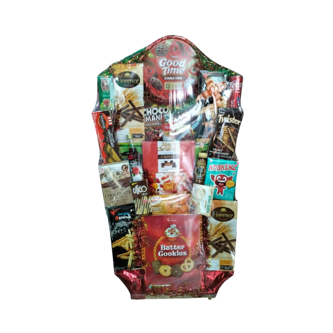 Inti dari Parcel Lebaran Riyadh adalah keberagaman isinya yang mencakup hampir semua jenis camilan premium yang menjadi favorit di hari raya. Di bagian puncak, terdapat kemasan bulat Good Time Double Choc yang ikonik, memberikan janji kelezatan cokelat yang intens. Di bawahnya, tersusun rapi berbagai produk biskuit dan wafer ternama seperti Butter Cookies dalam kemasan merah besar yang sangat klasik, biskuit Twister dengan isian cokelat melimpah, hingga biskuit Florence yang dikenal dengan cita rasa menteganya yang autentik. Kehadiran aneka stik cokelat dan wafer seperti Gery Chocolatos serta biskuit Krakenz menambah tekstur renyah yang akan menjadi rebutan saat berkumpul di ruang tamu. Keanekaragaman ini memastikan bahwa Parcel Riyadh mampu memenuhi selera semua kalangan, mulai dari anak-anak yang menyukai cokelat hingga orang dewasa yang menggemari biskuit gurih.