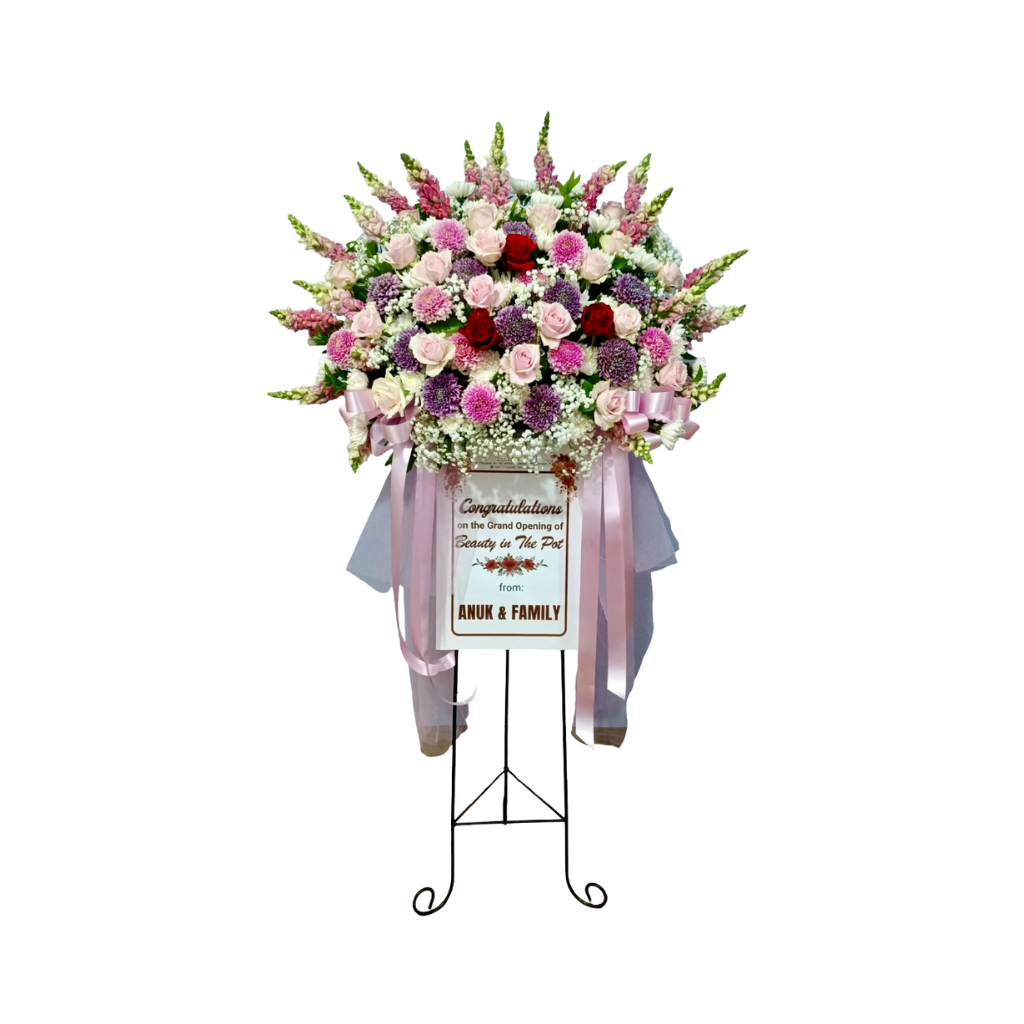 Bunga Standing Sprout adalah representasi keindahan dan awal yang baru, dirancang untuk menyampaikan ucapan selamat yang lembut namun berkesan. Perpaduan warna pink, putih, dan ungu menciptakan suasana damai dan penuh harapan, ideal untuk peresmian atau momen penting lainnya.